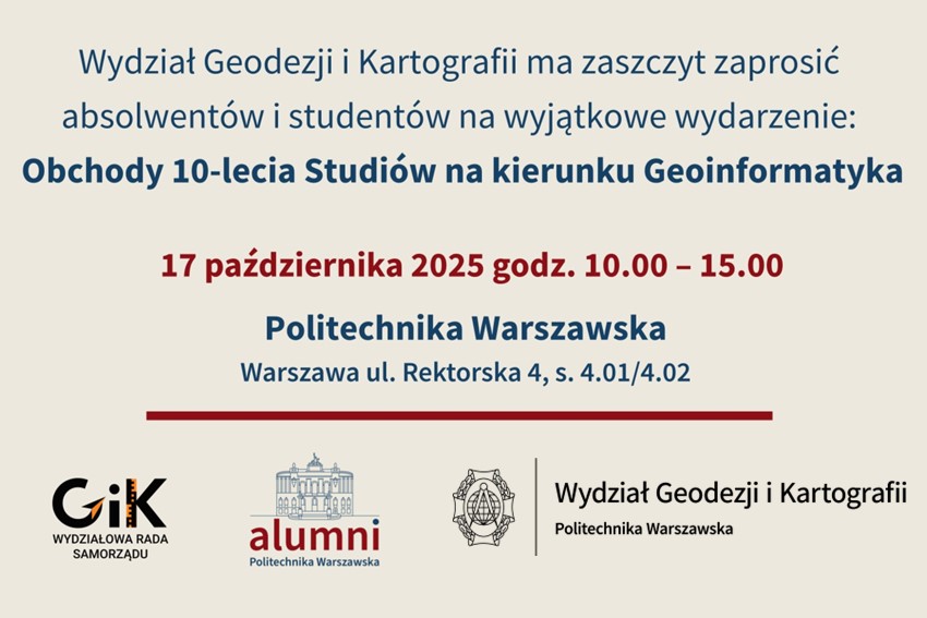 Serdecznie zapraszamy całą społeczność akademicką Wydziału GiK do wzięcia udziału w Obchodach 10-lecia Studiów na kierunku Geoinformatyka, które odbędą się 17 października 2025 roku, od godziny 10:00, w sali 4.01/4.02 w Gmachu Rektorska 4. W ramach wydarzenia, w godzinach 12:00 - 15:00, odbędzie się Debata pt. „Geodezyjne oko Wielkiego Brata. Powszechna inwigilacja czy fundament rozwoju Państwa i gospodarki?”, organizowana przez Biuro Karier PW, w ramach cyklu „Absolwenci w branży.