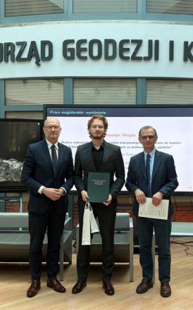 27 marca 2026 roku odbyło się uroczyste wręczenie nagród w Konkursie na najlepsze Prace Dyplomowe z Geodezji i Kartografii, organizowanym przez Stowarzyszenie Geodetów Polskich oraz Głównego Geodetę Kraju, w edycji 2024/25. Przypomnijmy, II miejsce w kategorii prac inżynierskich zdobył Wiktor Wiśniewski, absolwent kierunku geoinformatyka, natomiast wyróżnienie w kategorii prac magisterskich otrzymali Damian Wojda oraz Michał Zmorzyński.