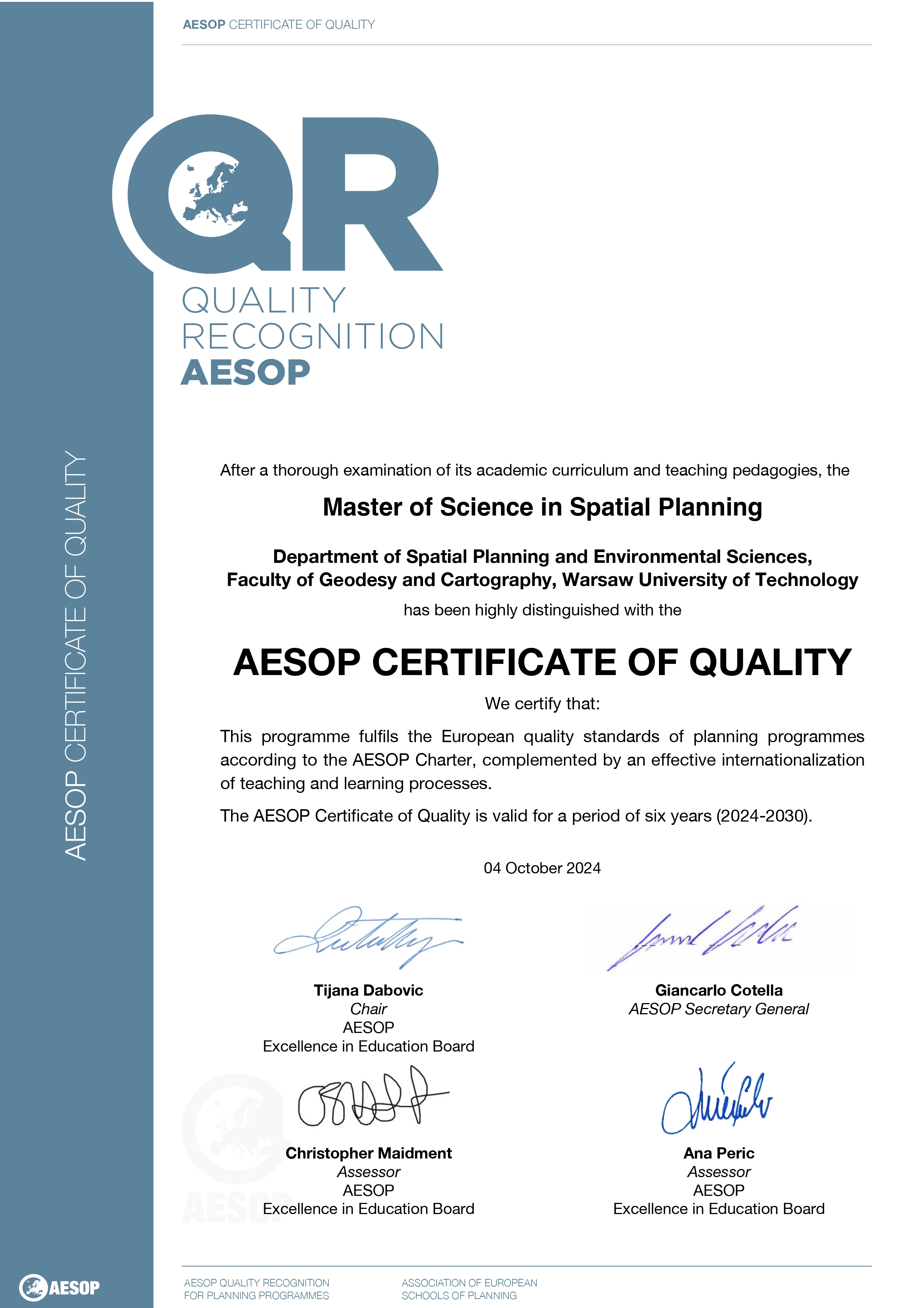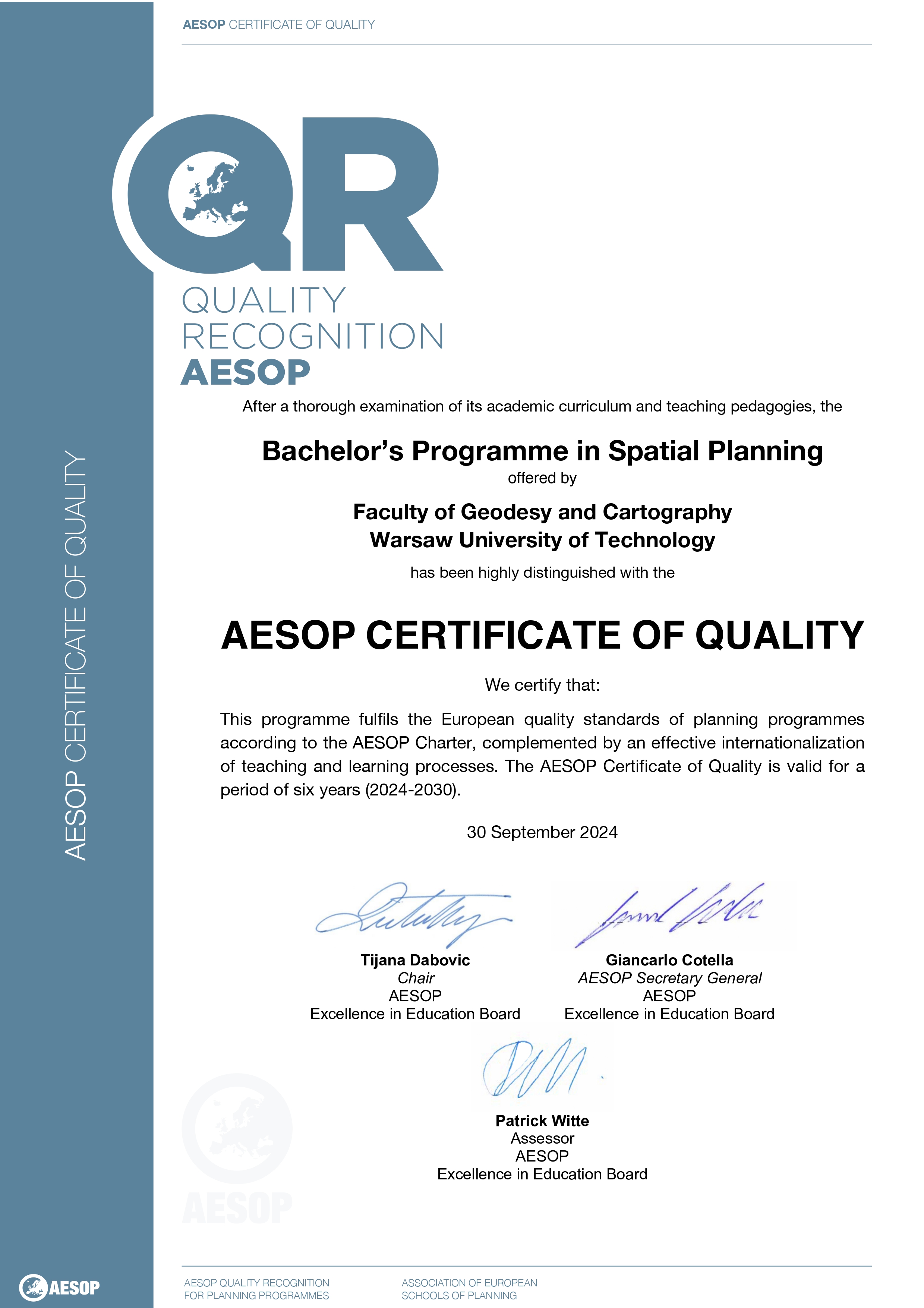 Programy studiów stacjonarnych pierwszego i drugiego stopnia, oferowane na kierunku Gospodarka Przestrzenna na Wydziale Geodezji i Kartografii Politechniki Warszawskiej, zostały wyróżnione AESOP Certificate of Quality (Certyfikatem Jakości przyznawanym przez Stowarzyszenie Europejskich Szkół Planowania Przestrzennego AESOP (Eng.: Association of European Schools of Planning). Certyfikat jakości został przyznany na lata 2024-2030.